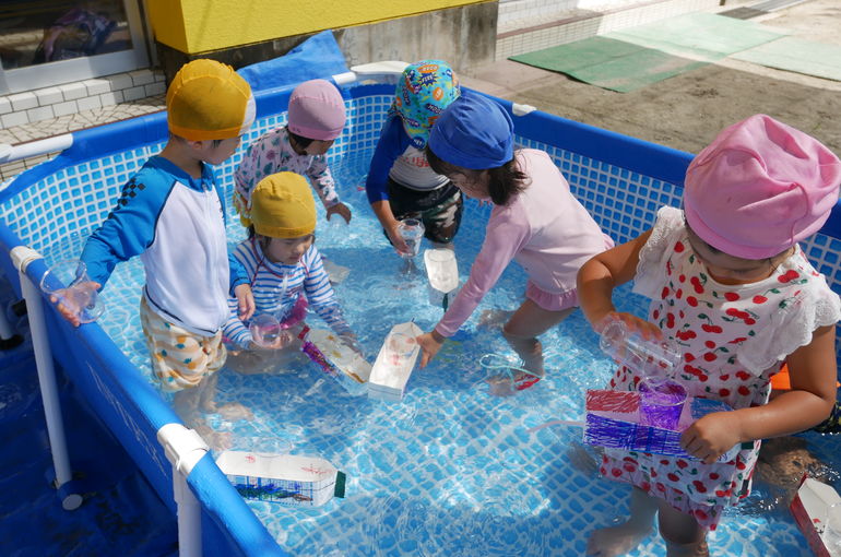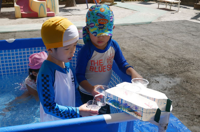 こりす組さんは、手作りのお船をプールに浮かばせて楽しんでいます?
