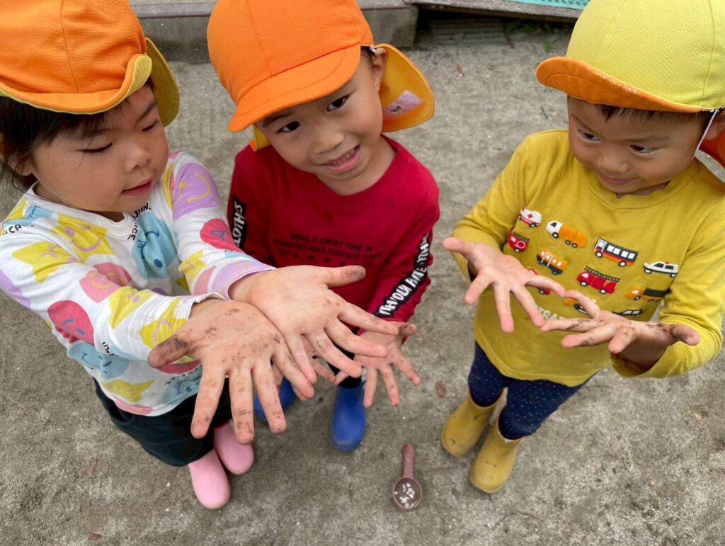 芋ほりの後の手は、頑張った”汁”し(印)がこんなに😁👍みんなが掘ったお芋は、給食の先生が何のおやつに変身させてくれるか楽しみです😋
