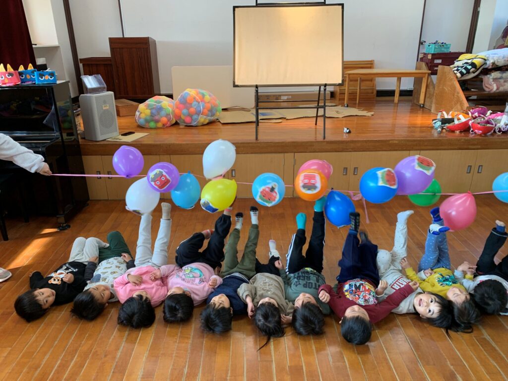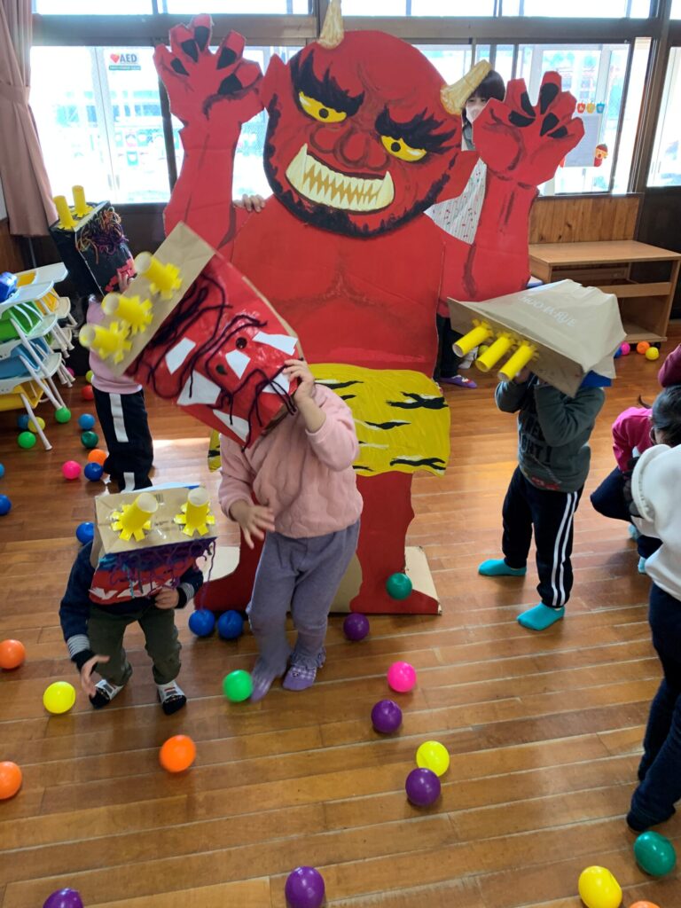 「鬼はそと~!福はうち~!」とボールを投げながら、みんなで鬼退治ができました👍