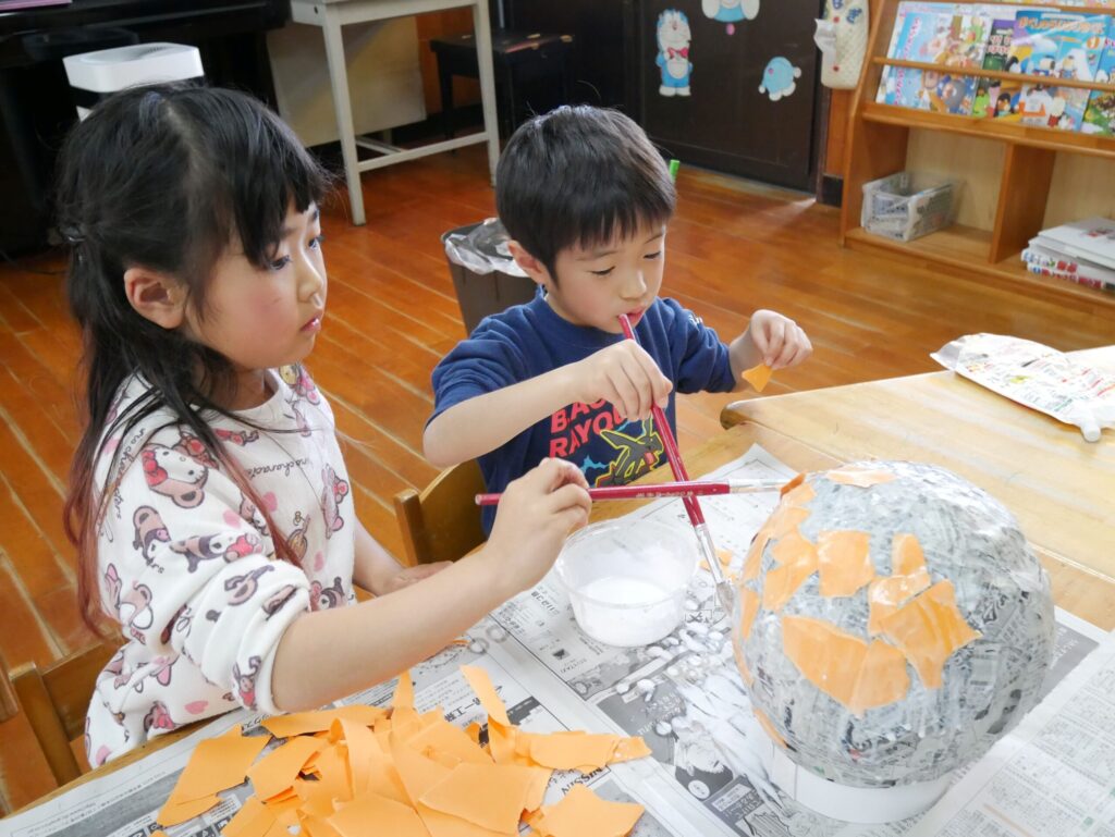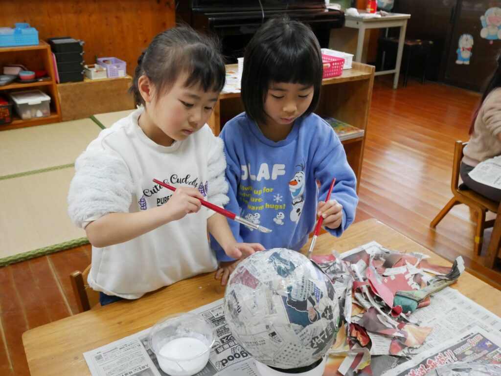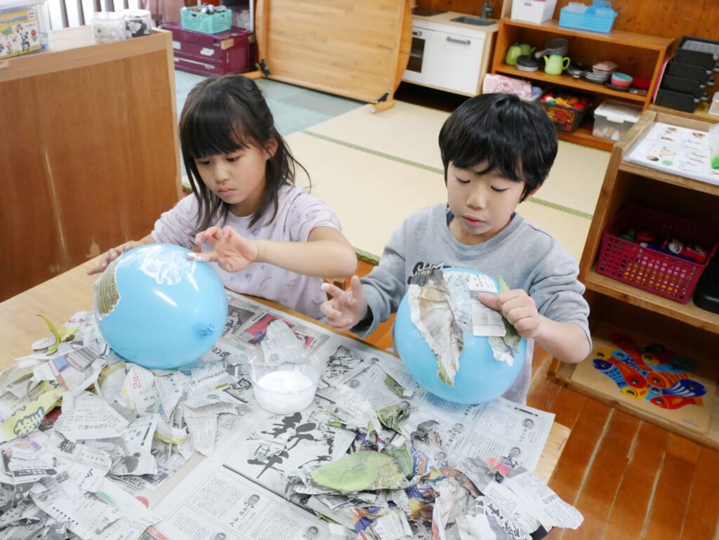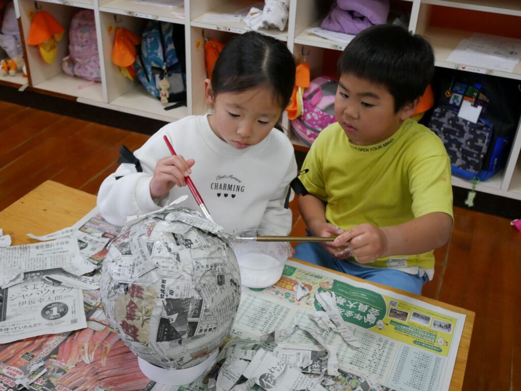 年長クラスのお友だちは、風船に新聞紙や画用紙を何日も何日もかけて根気強く貼り重ねていく”張り子”のお面づくりに挑戦しましたよ✊😲✨