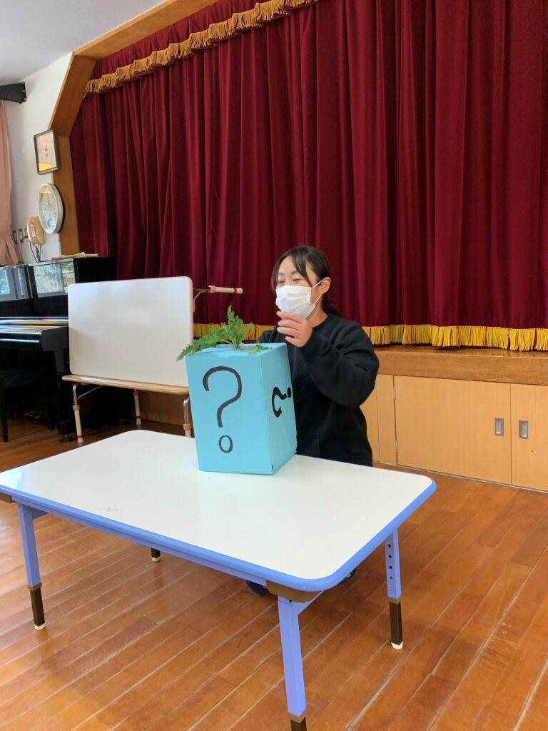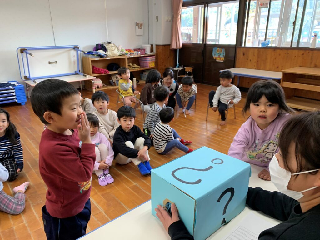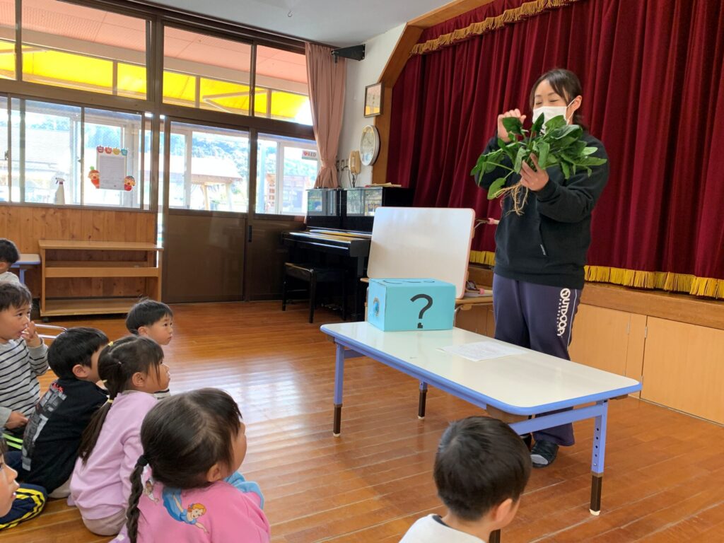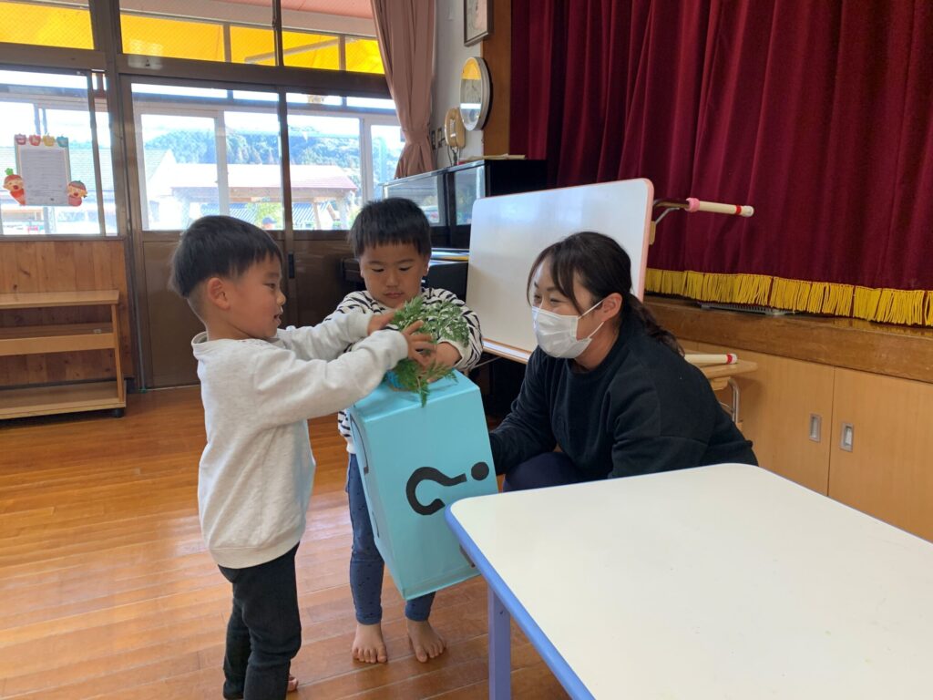 まだテーマを知らない子ども達は、ドキドキ…ワクワク…で「?ボックス」の中に手を入れて何の野菜なのか予想していきます🤭🎶